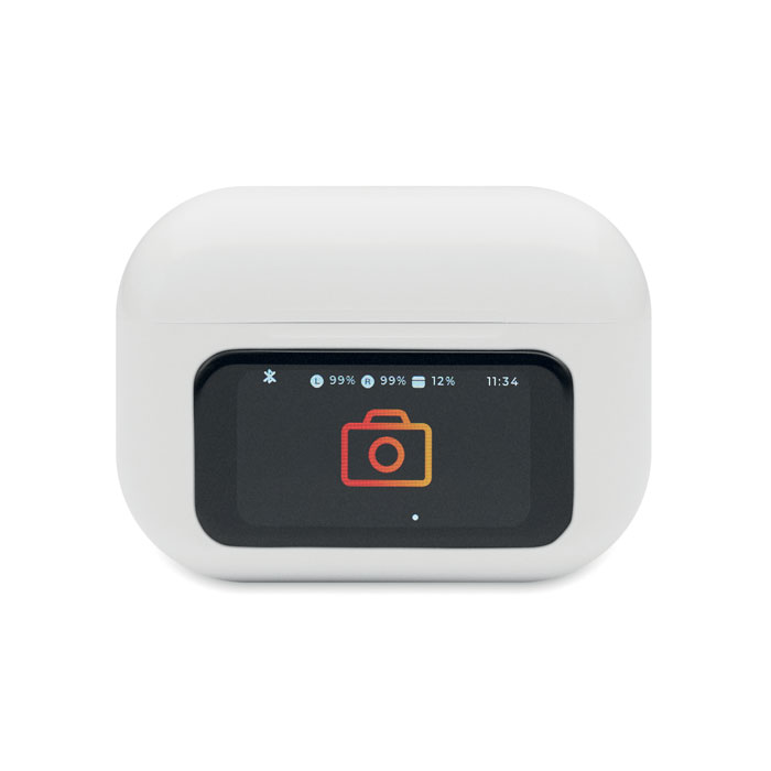 ABS True Wireless Stereo (TWS) 5.0 wireless stereo earbuds (30 mAh) with ANC/ENC and microphone and 230 mAh charging base. Touch screen control and display.