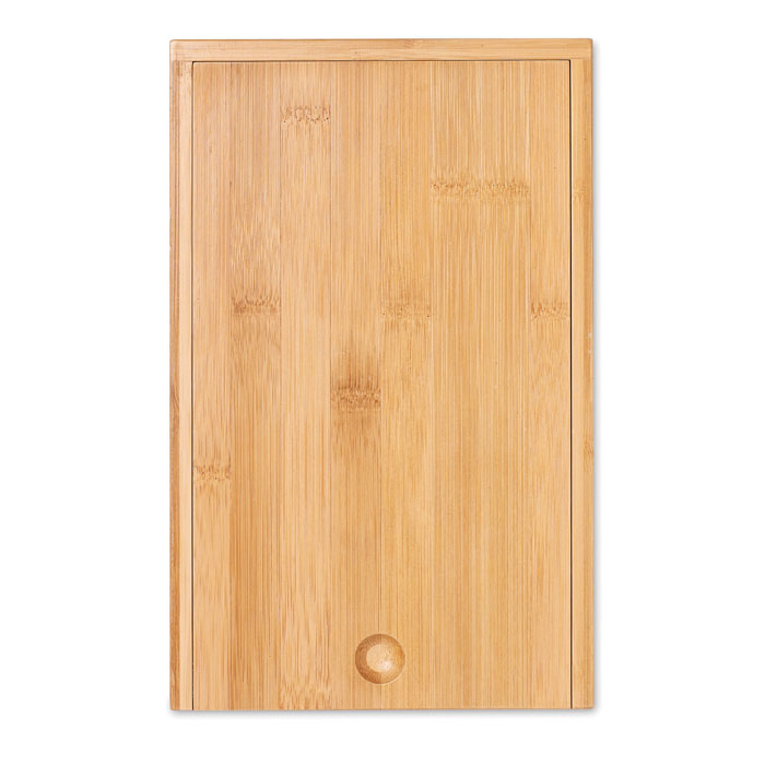 Bamboo cheese and wine set. Includes a stainless steel-knife, cheese peeler, bottle opener and wine stopper. Presented in bamboo box. Bamboo is a natural product, there may be slight variations in colour and size per item, which can affect the final decoration outcome.
